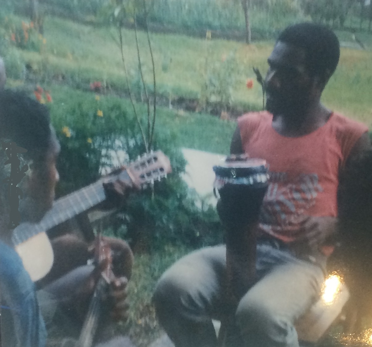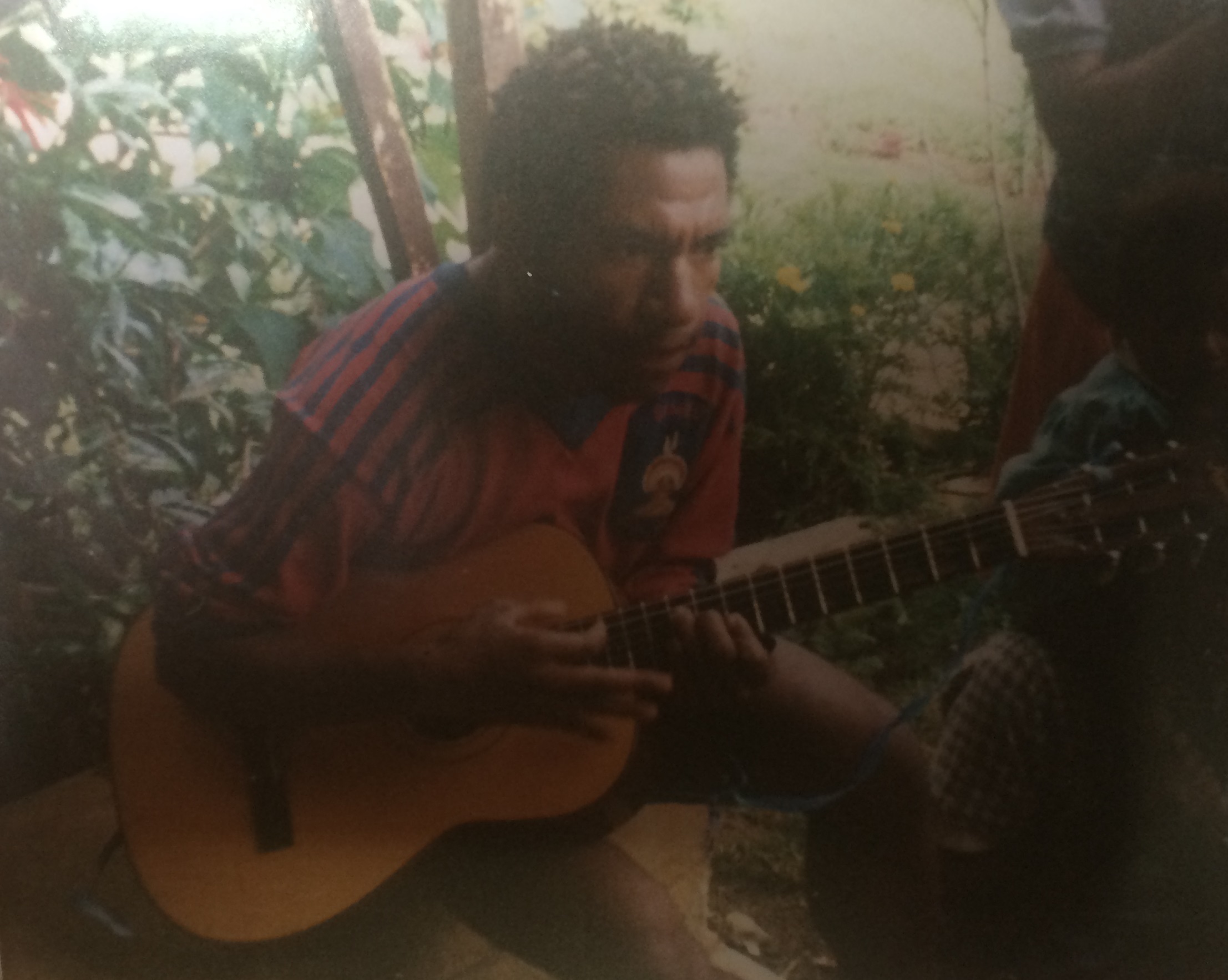 30. Bomai Jack, aged 21 of the clan Golin Kibaku, playing one of the four guitars of Dirima in January, 1987. Photographer: Vincent Barry Donohoe 187.